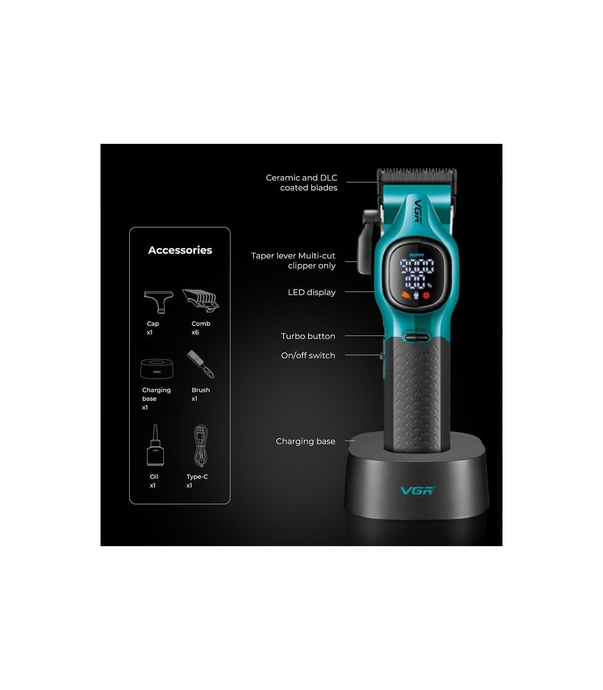- 6 عدد شانه الحاقی، استند شارژ، برس تمیز کننده، محافظ تیغه، روغن،کابل تایپ C